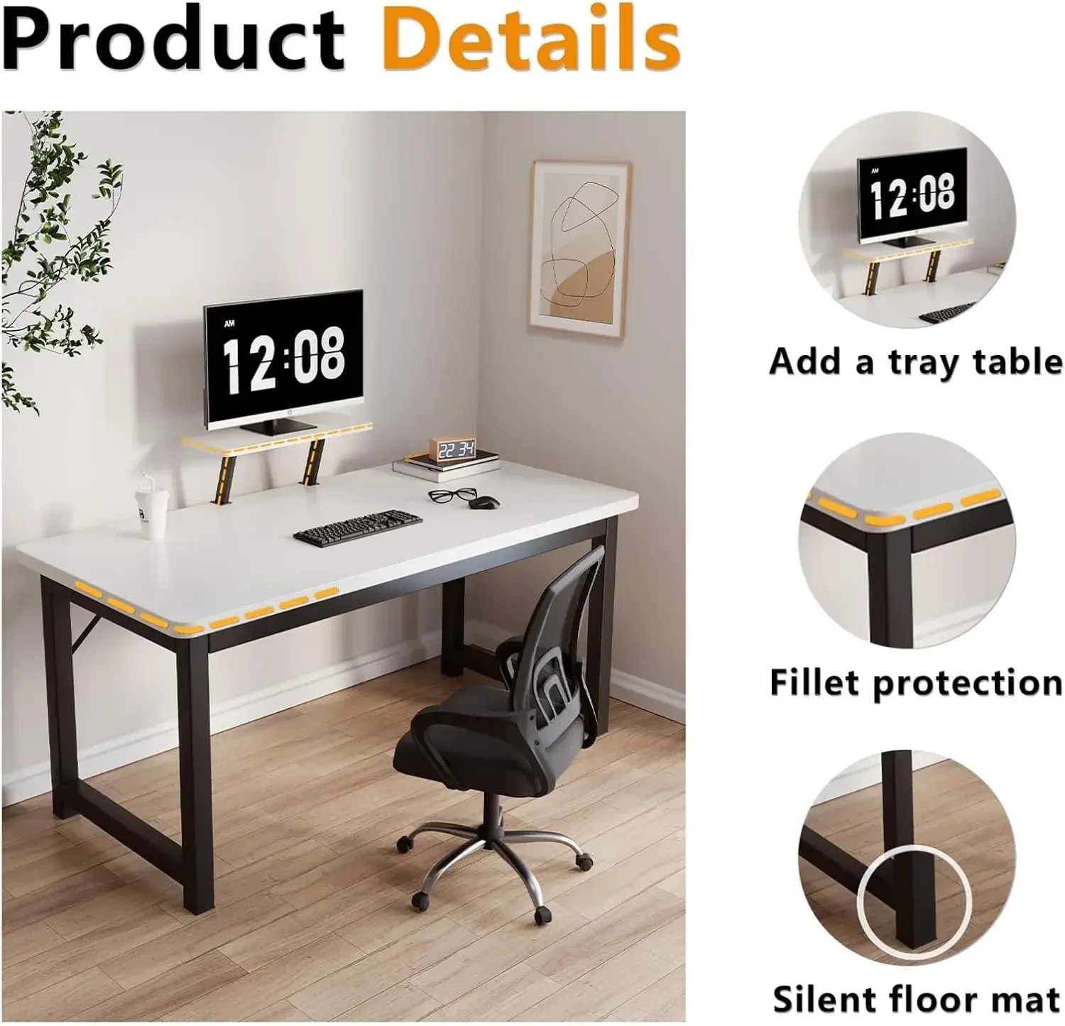 - [Desk with tray table holder]: This desk is designed with a monitor shelf that can placing monitors, has an ergonomic design and keep you comfortable during use.