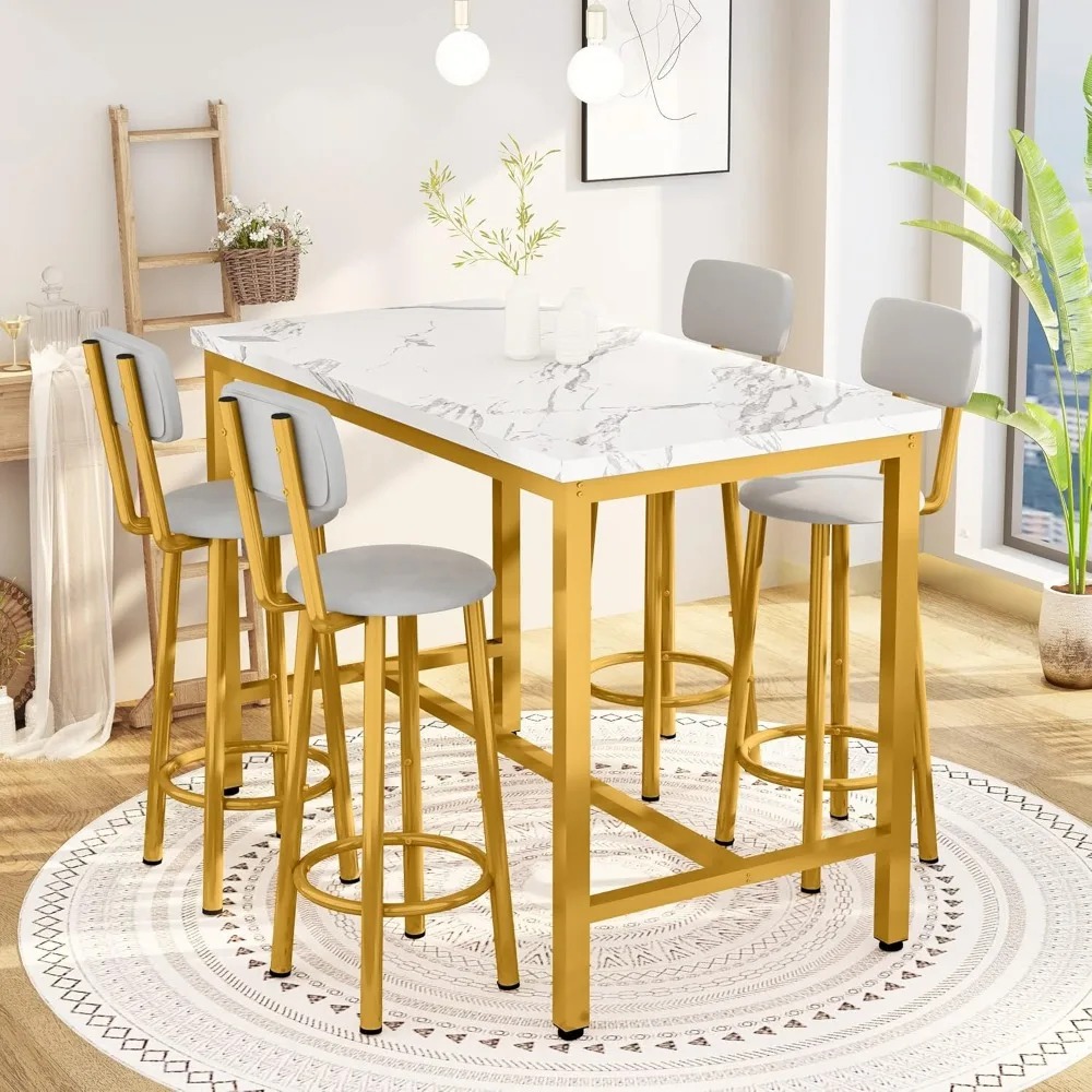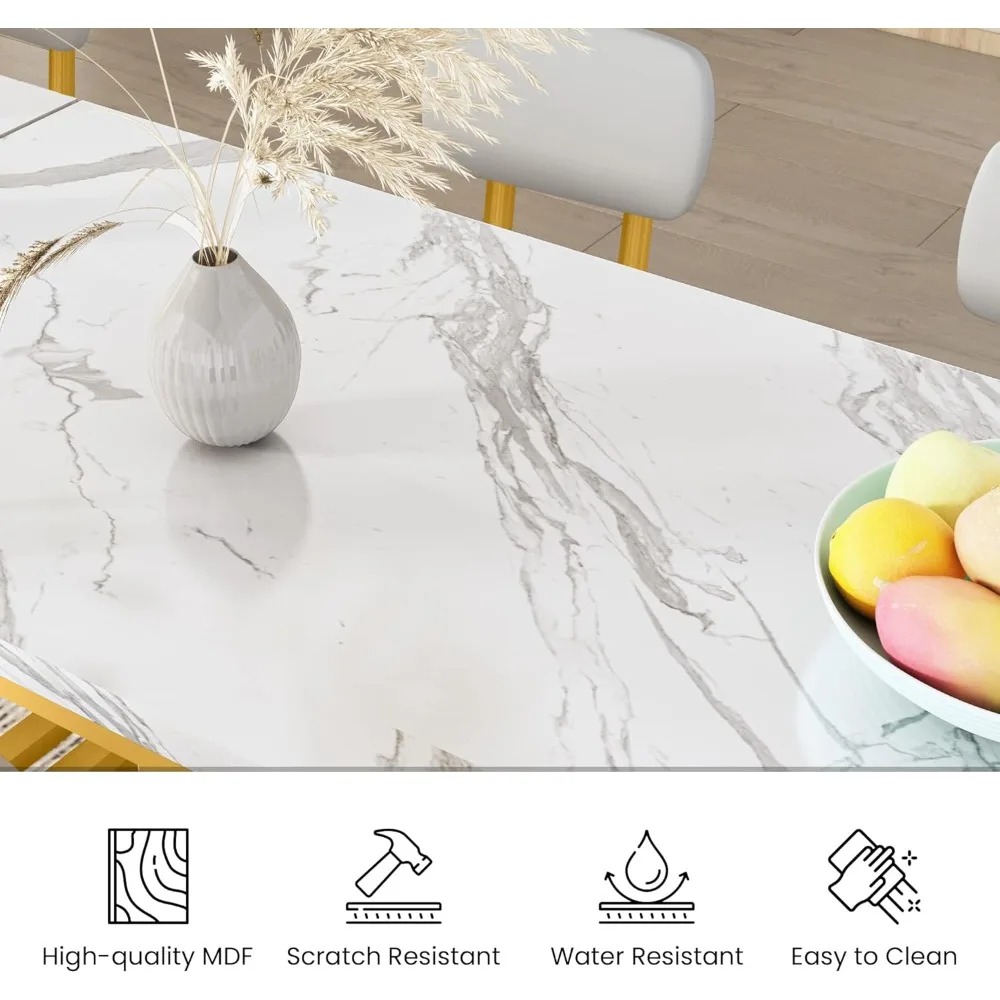 - Modern Style This White and Gold color dining table set for 4 with prime quality faux marble finish, the gold iron frame not only forms an appealing contrast to the white tone, but also suitable for most scenes, elegant and modern. It is a wonderful addition to your kitchen, restaurant, bar, or living room.