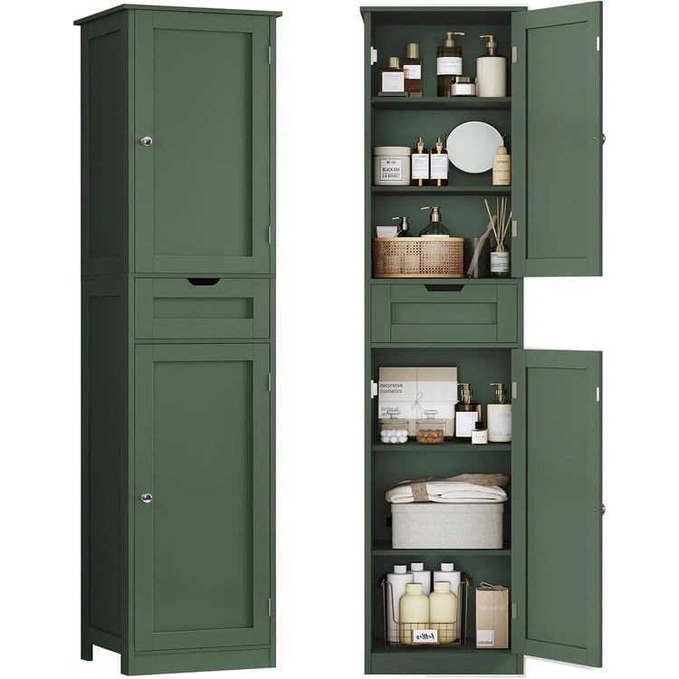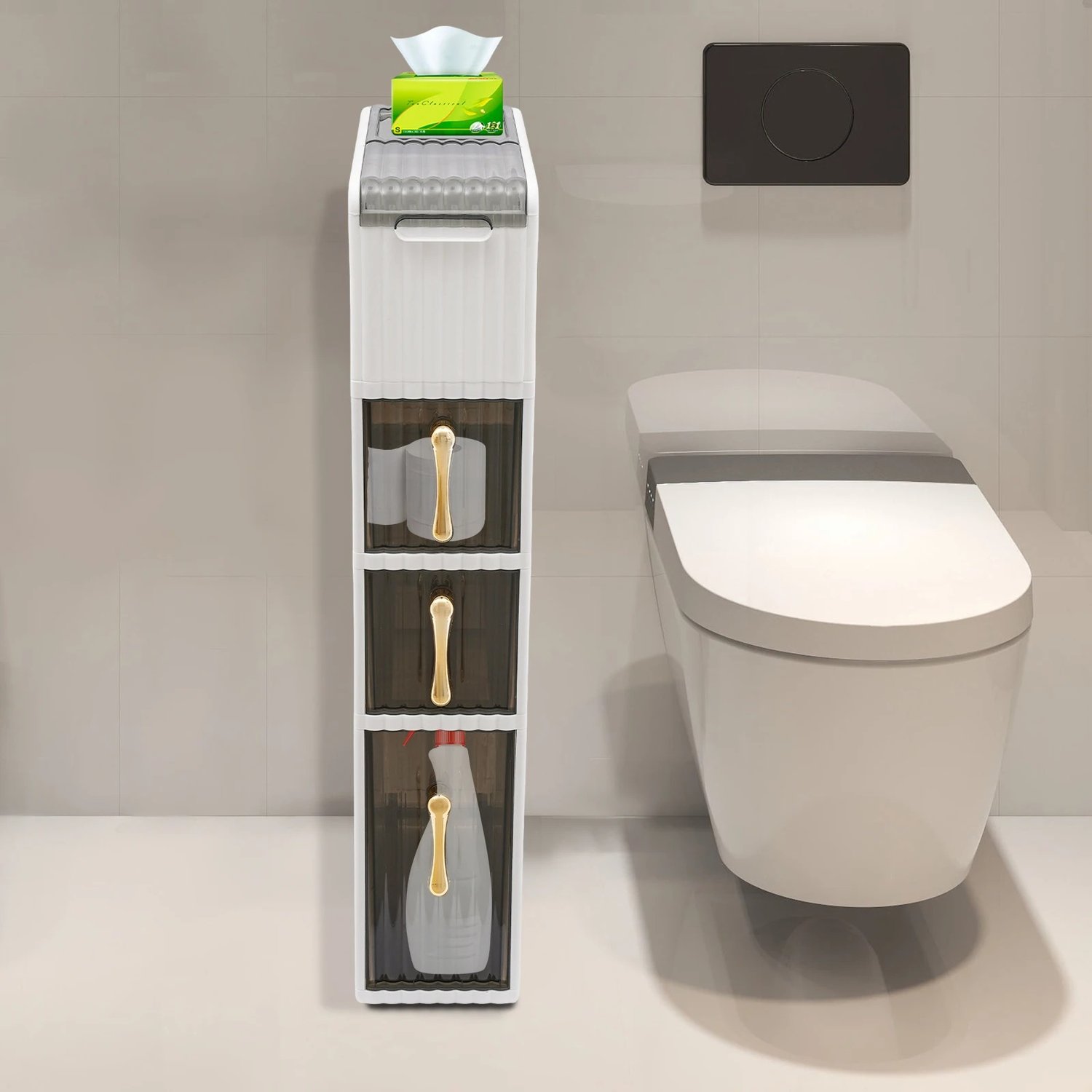 Space Saving: Its slim 7.48-inch width and vertical structure allow it to fit in tight spaces like between walls or beside the toilet.