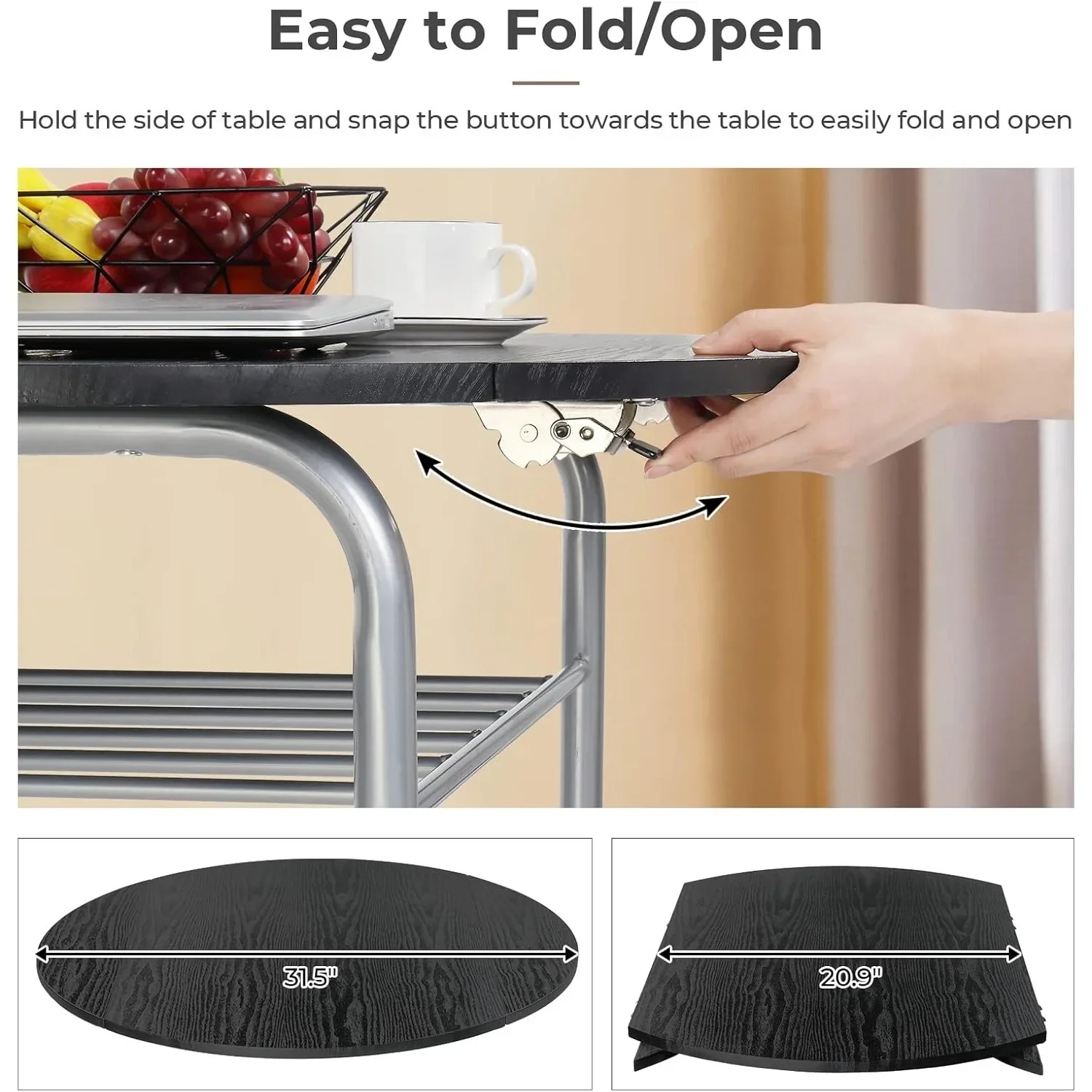 - 【Space Saving】The round drop leaf table has 2 leaves( 5.3" each)and measures 31.5inches L x 31.5 inches W x 30 inches H with both leaves up.You can easily fold down the drop leaves on both sides and turn the table into a more compact one, saving your space.