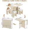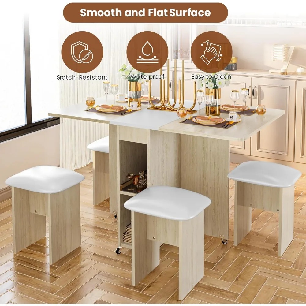 Folding Dining Table Set for 4, Dinner Table with 4 Leather Chairs and Shelves, Space Saving Foldable Dining Table with 6 Wheels