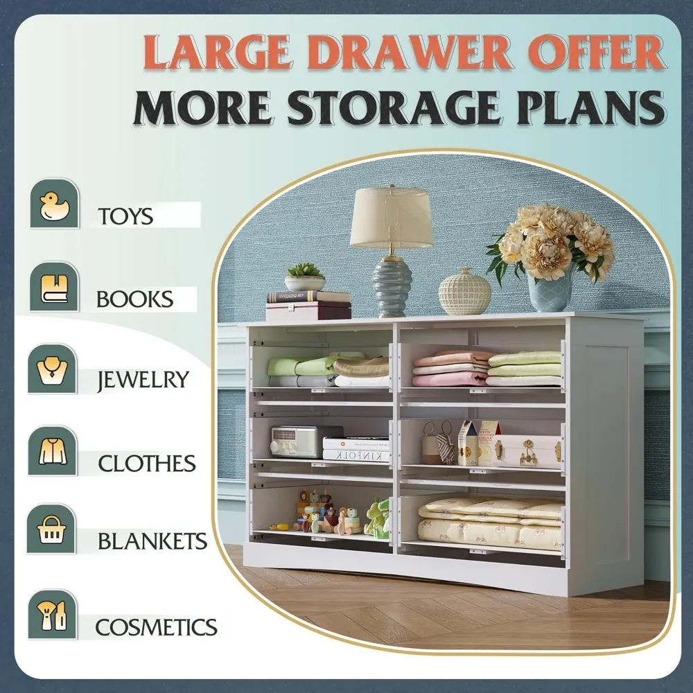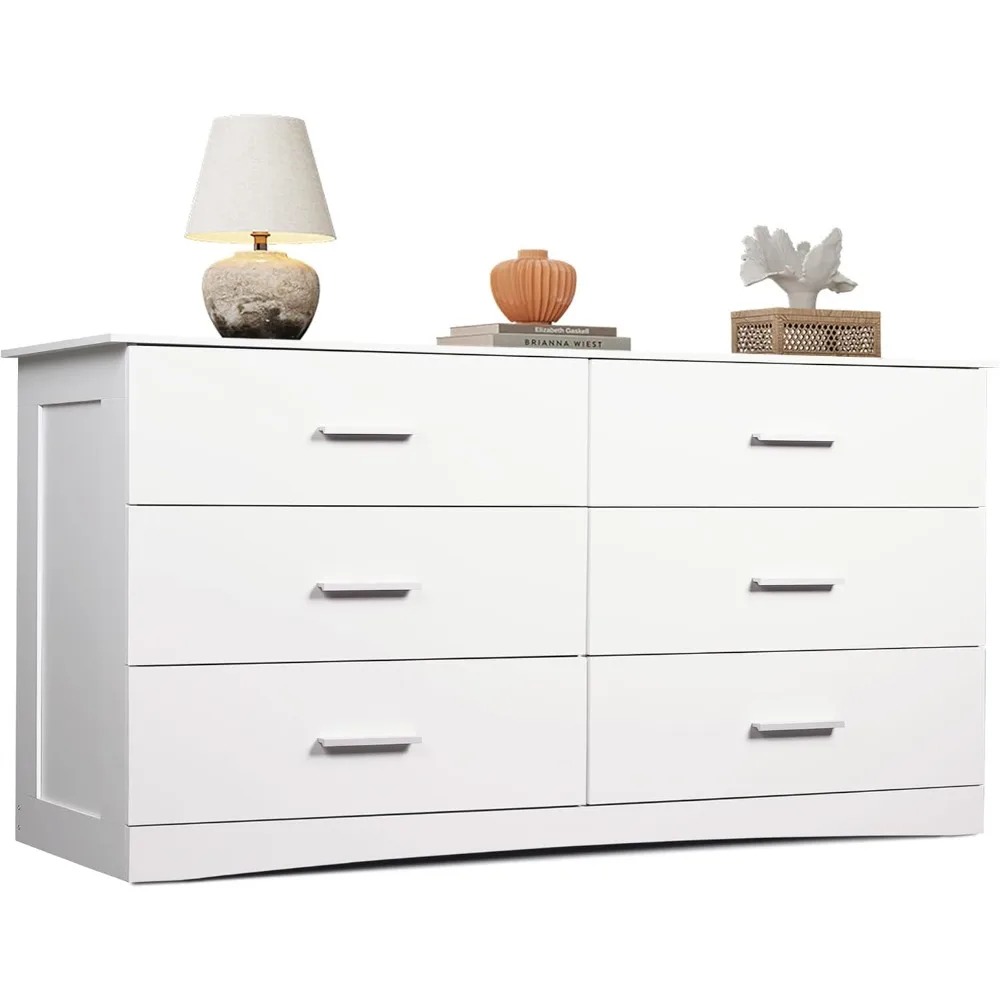 Wood Dresser for Bedroom, Wide Chest of Drawers with 6 Drawers, Large White Storage Tower Unit, Modern Minimalist Closet Store