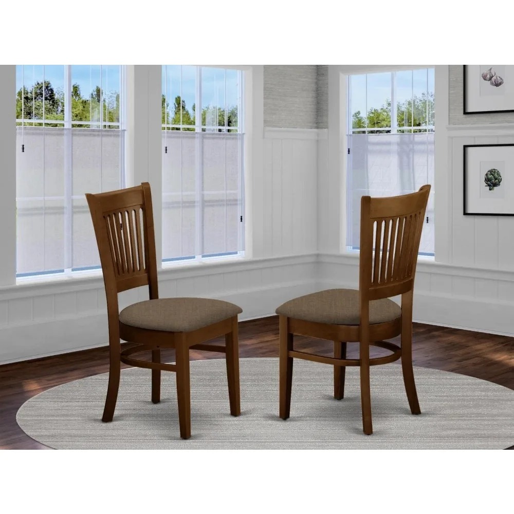 This modern dining chair set of two is designed to enhance the charm of your dining room with its timeless style. These chairs add elegance to your dining table, making family meals more enjoyable. They feature linen fabric seats and espresso slatted backrests, providing comfort and a sophisticated look. Crafted from durable Asian wood, known as rubber wood, these chairs offer stability and long-lasting quality. The vertical slatted back and elegant legs not only contribute to a contemporary appearance but also ensure a comfortable and supportive dining experience. The dimensions of these dining chairs are 20 inches in length, 17 inches in width, and 37 inches in height. They come packaged in a single box.
