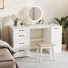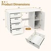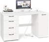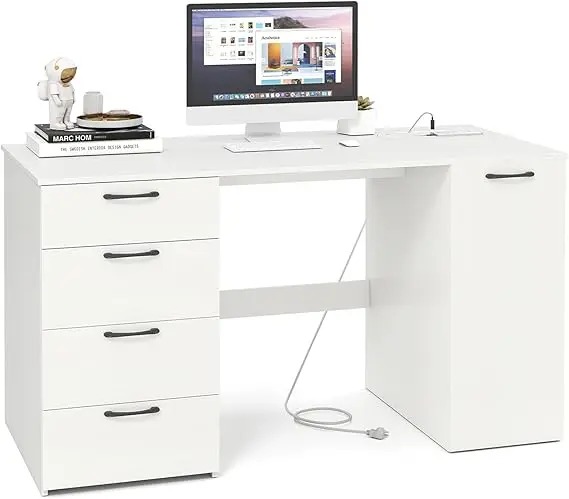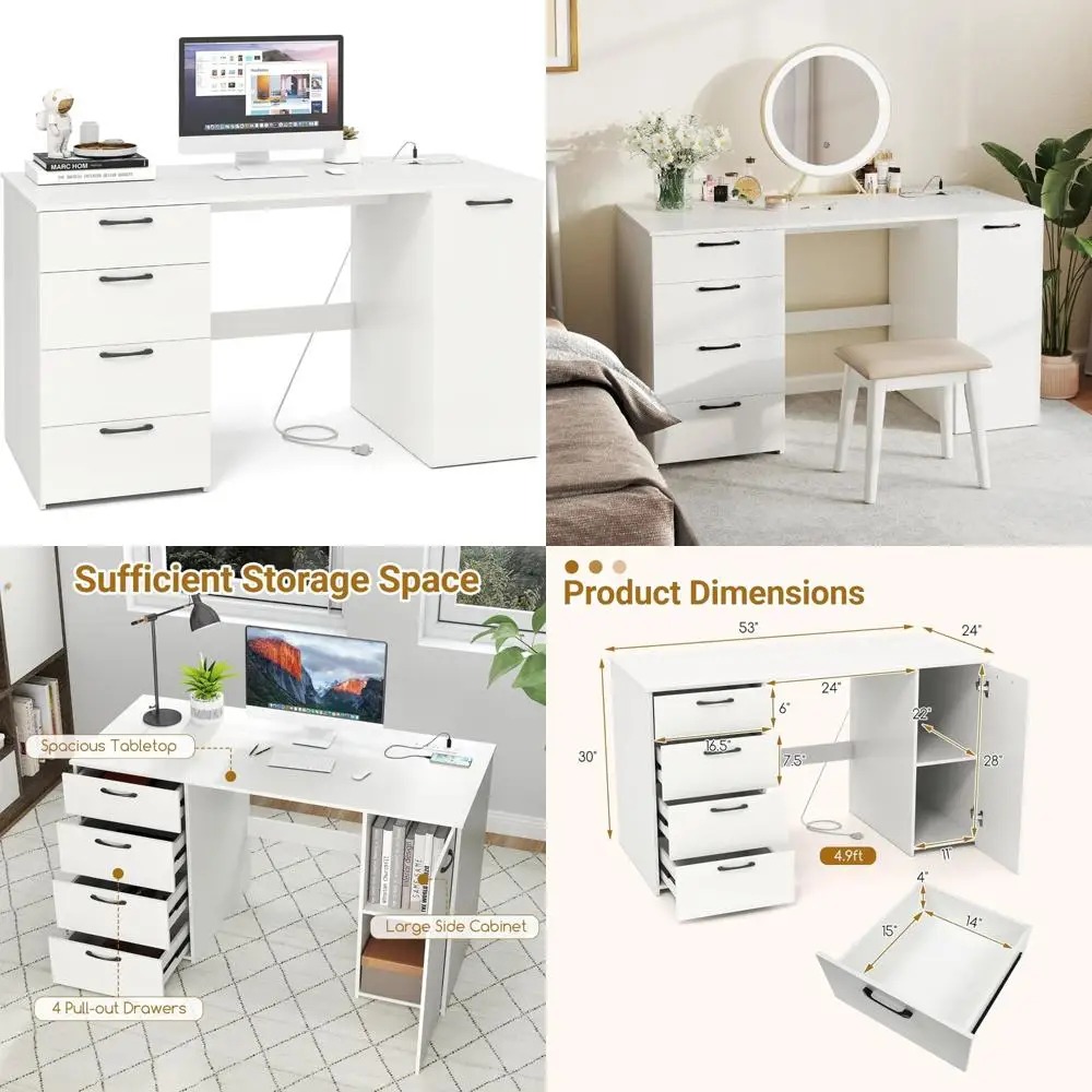 This home office desk offers a convenient charging station with two AC outlets (125V/12A), one USB port (5V/2.4A), and one Type-C port (5V/3A), allowing you to charge multiple devices simultaneously. The cable management hole at the back of the cabinet keeps wires organized and untangled. The desk features a spacious tabletop measuring 53"L x 24"W, providing ample room for work or study. It includes four pull-out drawers and a large side cabinet for organized storage of files, books, and stationery. The side cabinet is equipped with a 5-position adjustable shelf that can accommodate items of varying heights, with 2.5" of adjustable spacing. The shelf can be adjusted to fit books and baskets or removed to accommodate taller items. The desk is designed with smooth metal slides and easy-to-grip handles for effortless drawer operation, reinforced with a crossbar for structural support. Non-slip bottom pads protect the floor from scratches. With a modern finish and a long 4.9 ft power cord, this desk is perfect for professionals, students, and remote workers, offering a clean and minimalist look in various setups or locations.