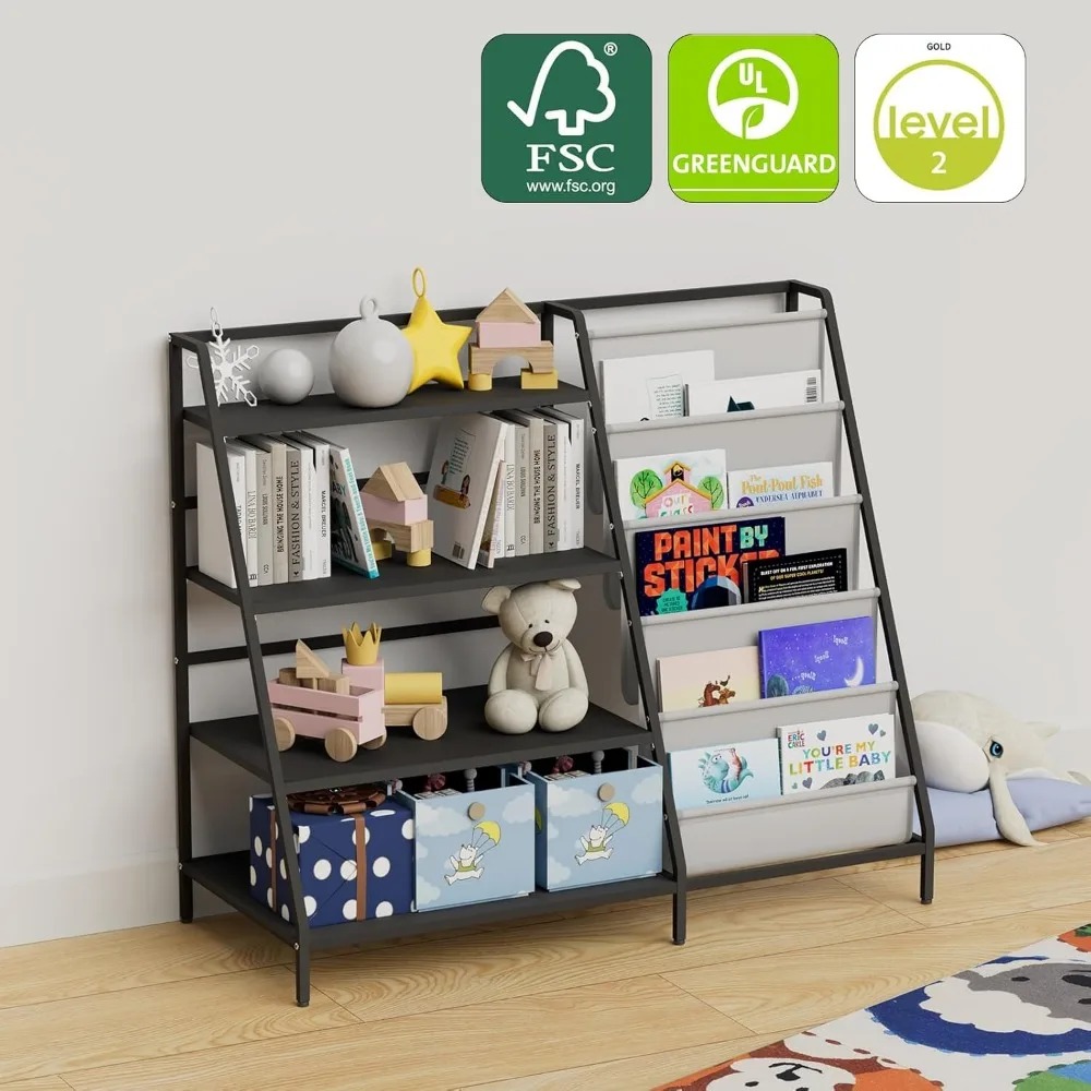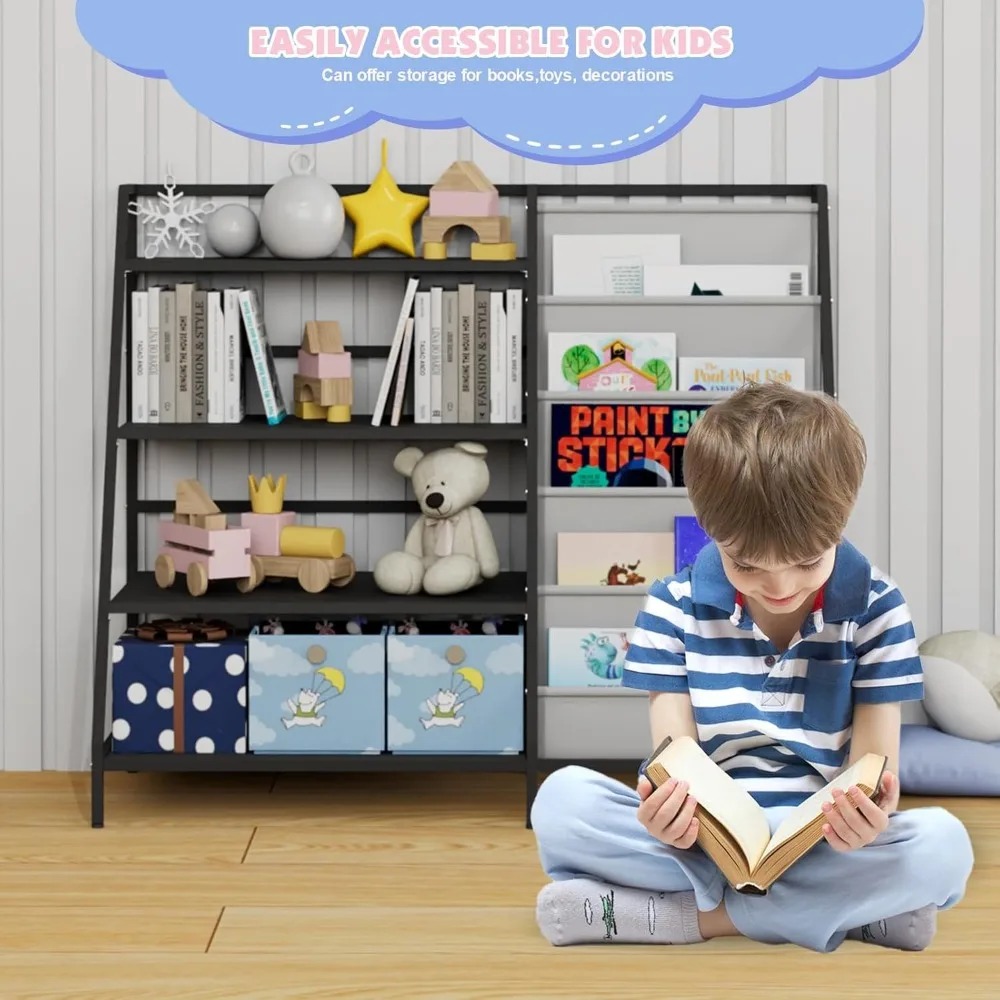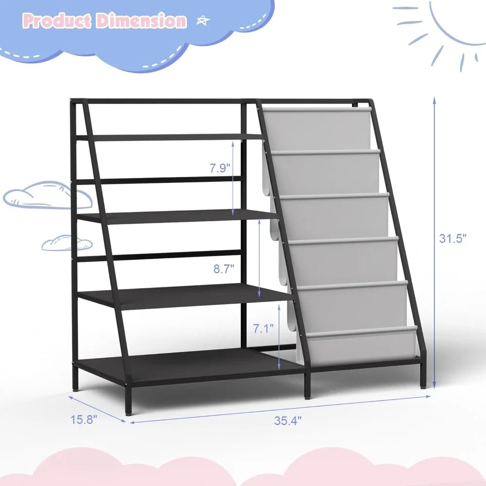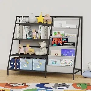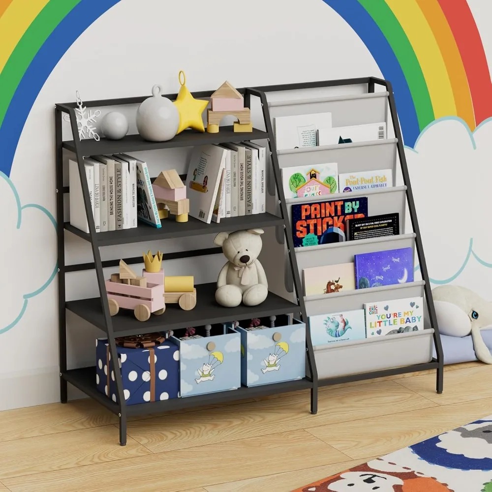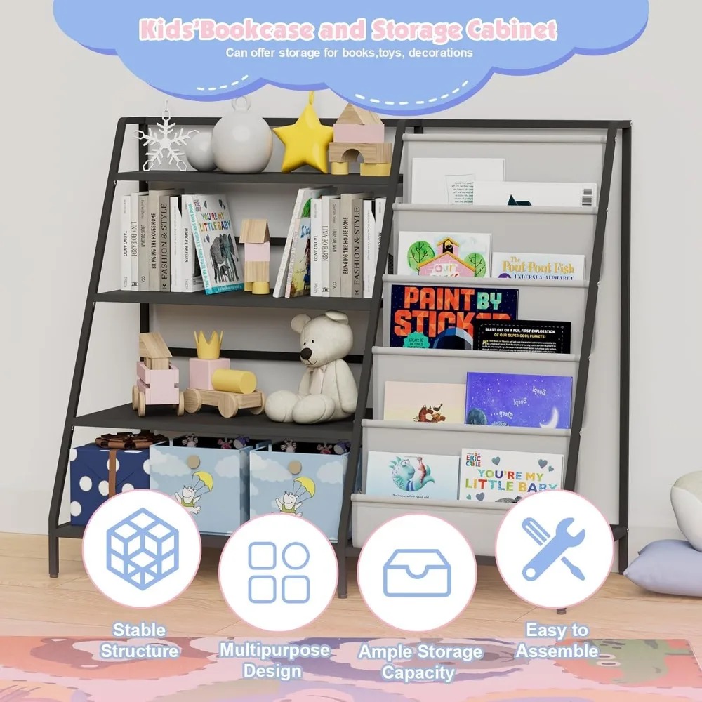 Discover our sturdy children's bookshelf, designed to accommodate growing collections with ease. This multi-tiered metal bookshelf features four display shelves and five deep storage pockets, perfect for organizing books, toys, art supplies, and more. It helps keep books neatly stored, freeing up floor space for children to play and explore. Crafted with children in mind, our bookshelf is at an ideal height for little ones to reach and store their books independently. This design encourages self-reliance and promotes good organizational habits, leading to a tidy room without scattered books and toys. Assembling this bookcase is a breeze, suitable for children aged 3 and above. It measures 35.4 inches wide, 31.5 inches high, and 15.8 inches deep (approximately 90x80x40 cm). All necessary hardware and clear, step-by-step instructions are included for a straightforward setup process. This four-tier bookcase is not just a storage solution but also a versatile organizer for toys, books, and art supplies in any child's space, whether it's a bedroom, playroom, or daycare. It also includes dedicated areas for displaying photos and decorations, making it ideal for storing blocks, dolls, model cars, and other keepsakes. Its compact design saves space while meeting diverse organizational needs. Our nursery bookshelf is more than just functional furniture; it's an interactive learning tool that fosters a love of reading and organization. Children can easily organize and explore their books, building independence and a sense of accomplishment. This bookshelf makes the perfect gift for kids, suitable for Christmas, birthdays, or any special occasion. With its clean lines and vibrant colors, it enhances any child's room while providing essential storage. It helps keep their space tidy and inspires fun by organizing and displaying books, small toys, and cherished memorabilia. --- This description maintains the original meaning while avoiding any sensitive terms and special symbols.