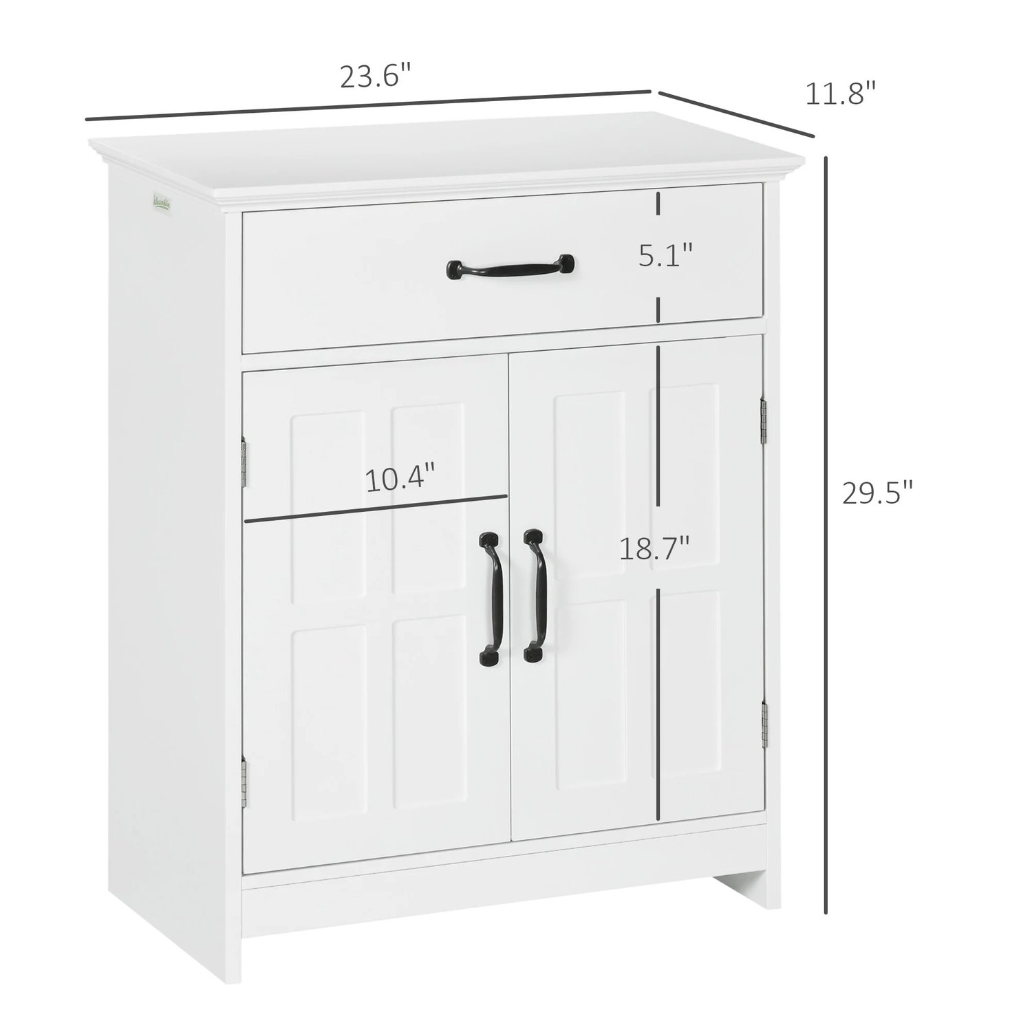 ● Color: white ● Materials: particle board, metal ● Overall dimensions: 23.6" w x 11.8" d x 29.5" h ● Drawer inner size: 11" w x 9.4" d x 3.1" h ● Cupboard inner size: 20.9" w x 9.8" d ● Shelf height (in the middle): 8.7" / 9.4" h ● Bottom to floor height: 1.6" h ● Weight capacity: 44 lbs. (total), 11 lbs. (shelf)