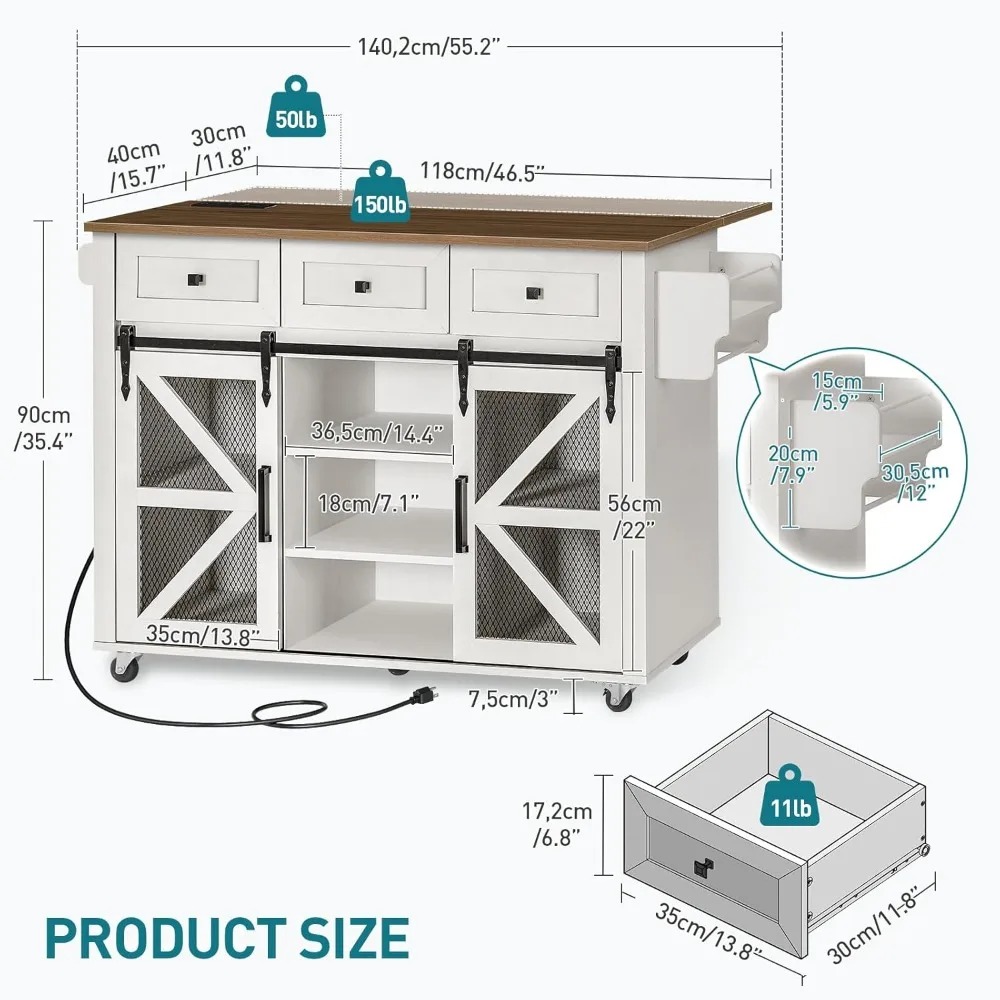 Kitchen Island with Storage, Kitchen Cart with Charging Station, Rolling Kitchen Island Table with Drop-Leaf, 3 Drawers