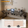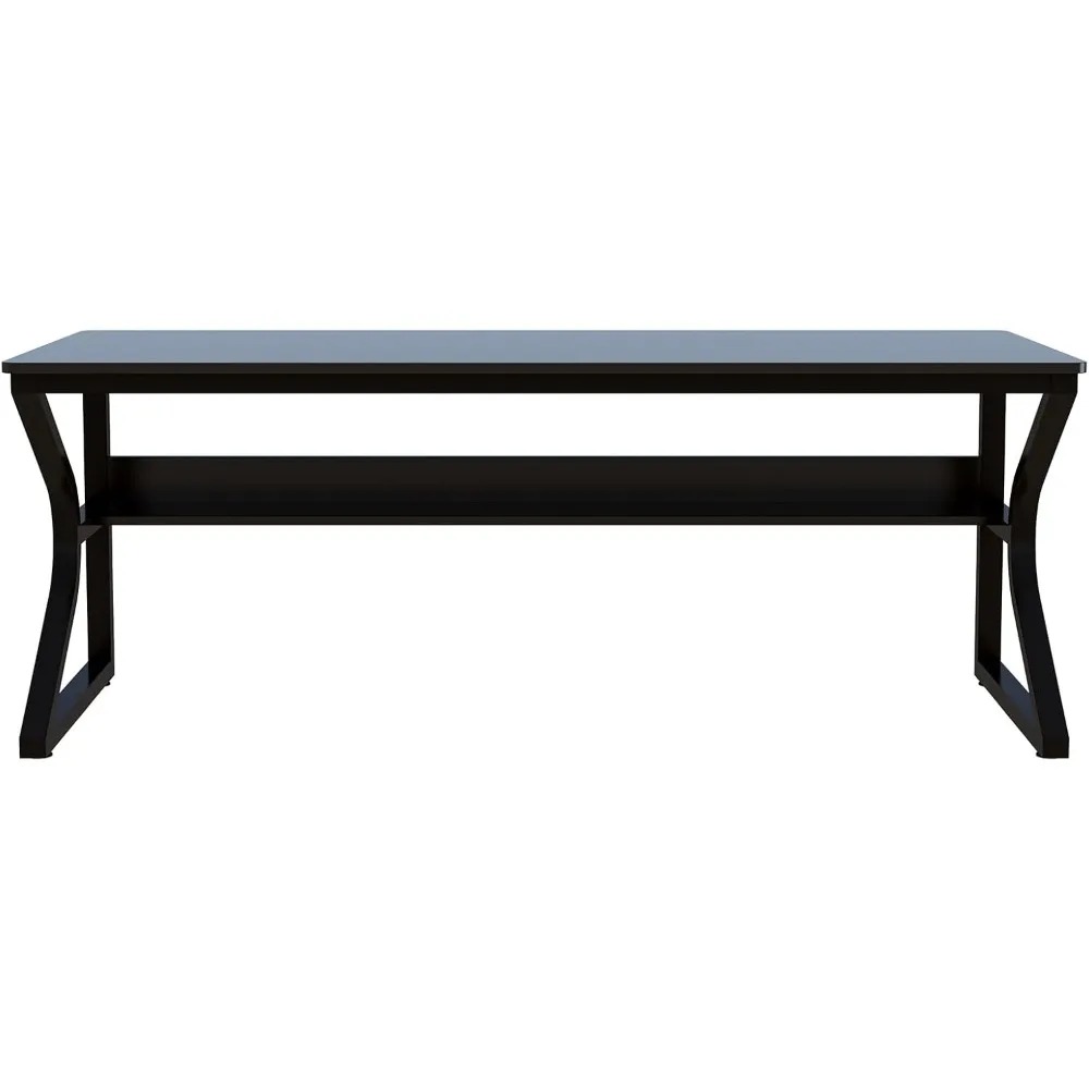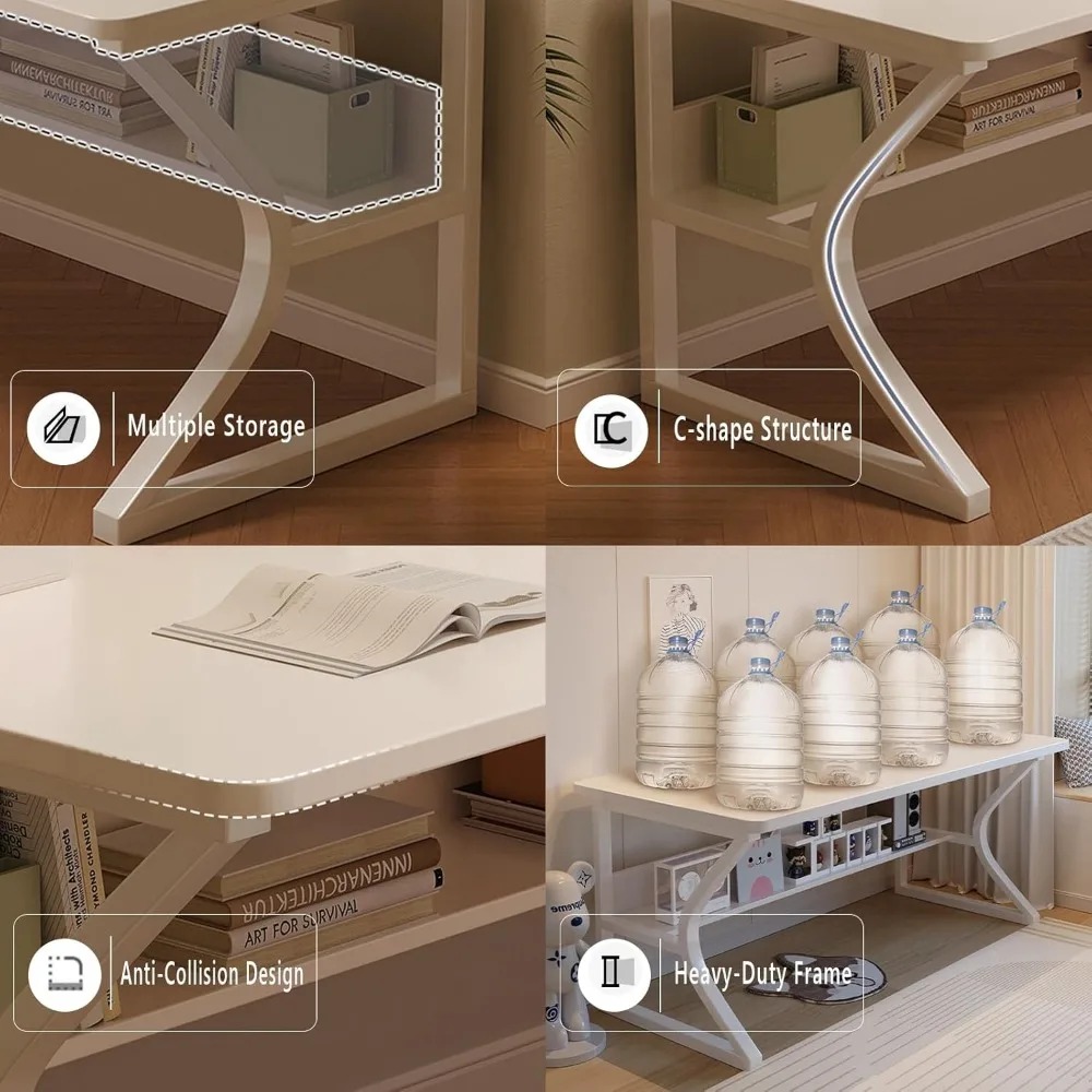 This product features an extra-long desktop made from a single piece of wood, ensuring a smooth surface and enhanced stability. The table is designed for easy assembly and offers a spacious working area. It includes a storage shelf beneath, providing additional stability and extra storage space for books and office supplies. The shelf is positioned 14.6 inches above the ground, allowing for comfortable legroom. This versatile table can serve as a study desk for the family, a gaming table, or an office desk, suitable for various settings such as living rooms, study rooms, and offices. The table is constructed with a sturdy metal frame and boasts a 0.61-inch thick desktop that is scratch-resistant, easy to clean, and capable of supporting up to 600 lbs. The corners of the desktop are rounded to prevent injuries from bumps, and the adjustable foot pads ensure stability on uneven surfaces, preventing damage to the floor and enhancing the table's stability.