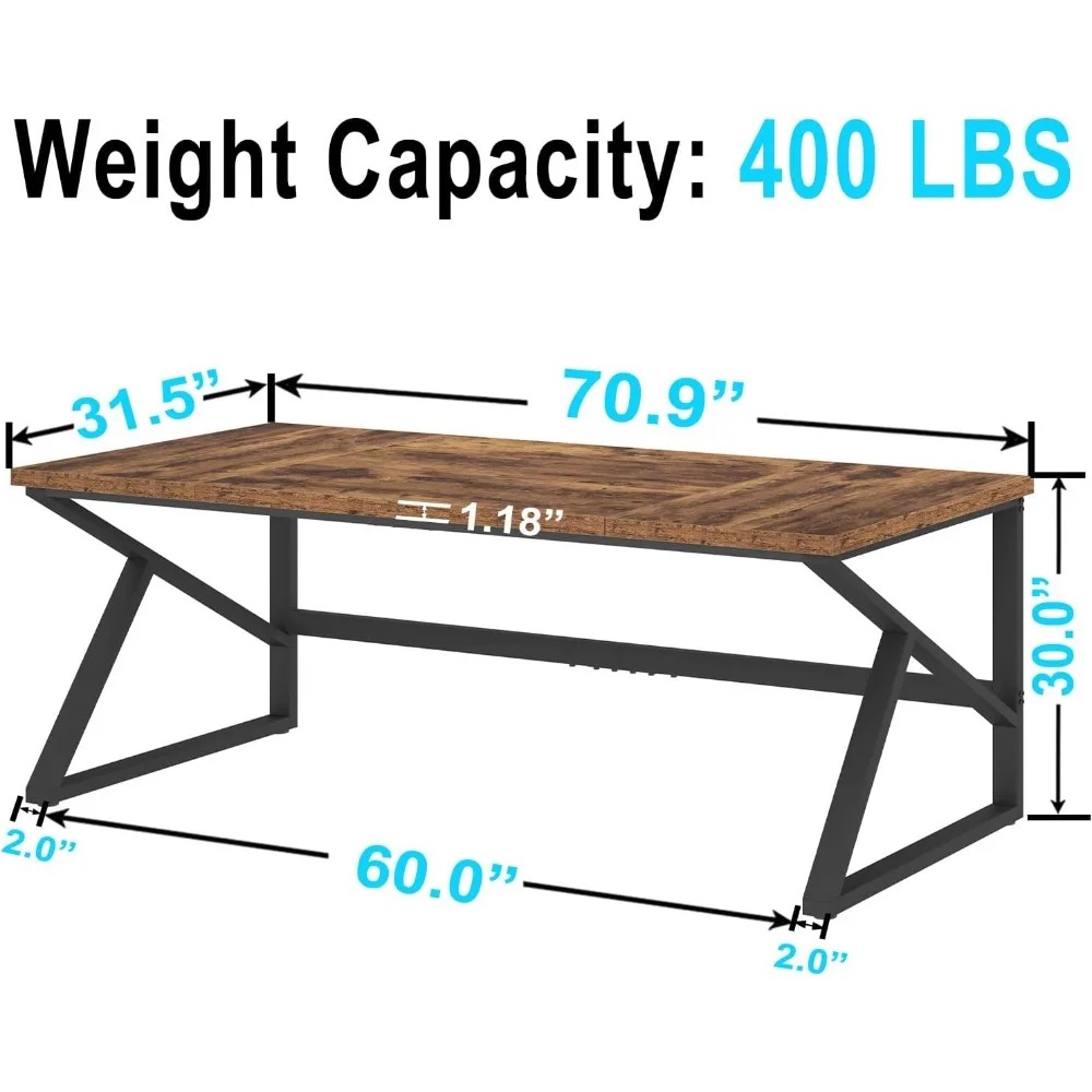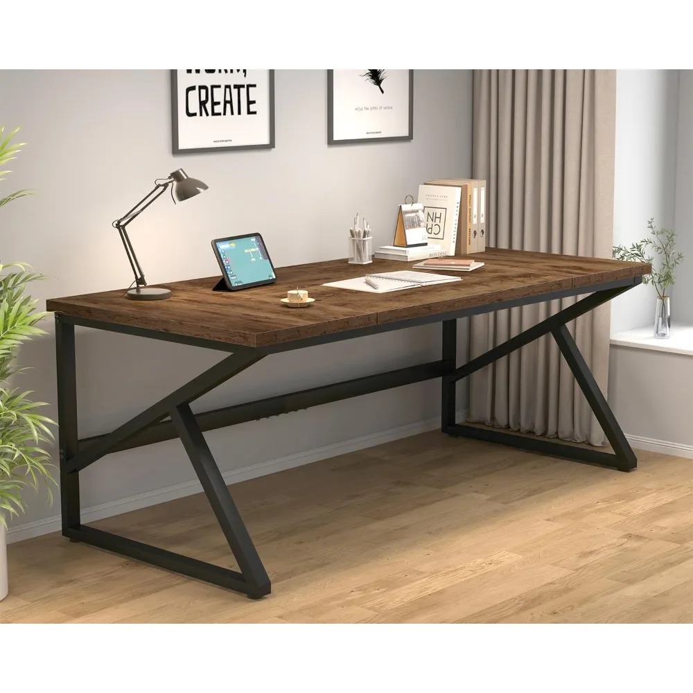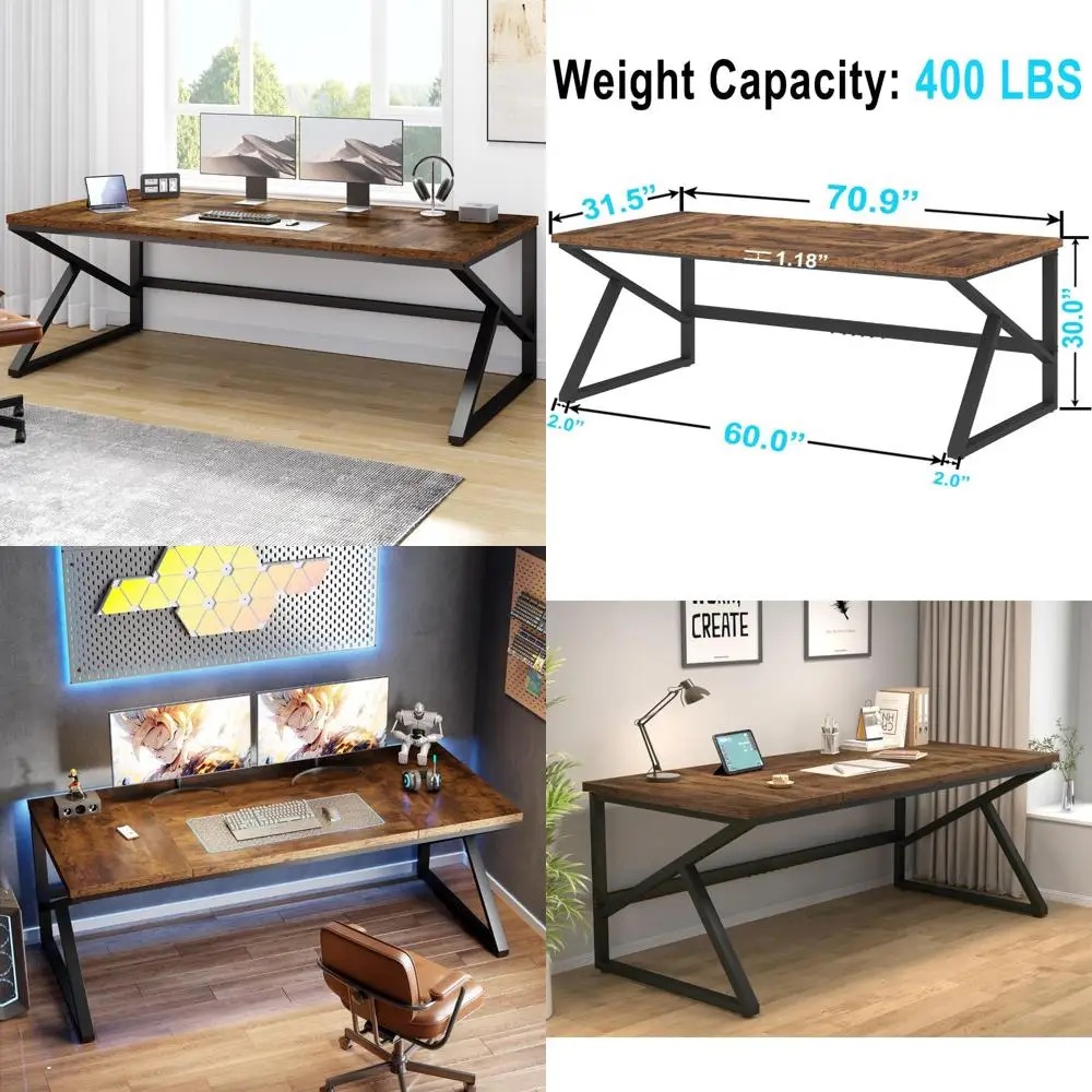 The desk measures 31.5 inches deep by 70.8 inches wide by 29.5 inches high, providing ample space for multiple monitors, a PC, laptop, printers, files, books, lamps, and other office essentials. The desktop is crafted from three joined panels, creating a cross-grain effect, and features two K-shaped metal legs that offer plenty of leg room for comfort during extended use. - **Durable Construction**: Made with three high-quality MDF panels and two thick K-shaped metal legs, this 70-inch desk ensures stability and can support up to 400 pounds. The adjustable levelers can be used on uneven ground to keep the desk balanced and prevent scratches. - **Modern Design**: The desk has a sleek, modern look with clean lines and sturdy metal legs, enhancing the aesthetics of your home office, bedroom, or living room while also improving efficiency and productivity. - **Versatile Functionality**: This long desk serves multiple purposes, working well as a home office desk, computer desk, writing desk, study desk, executive desk, gaming desk, or workstation desk. Its adaptable design caters to various needs and environments. - **Easy Assembly and Quality Guarantee**: Each component of the desk is clearly labeled, and detailed instructions and illustrations are provided for easy assembly within 30 minutes or less.