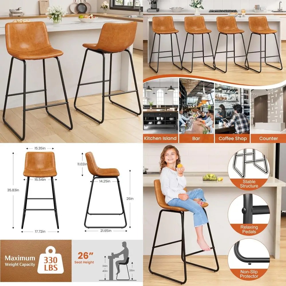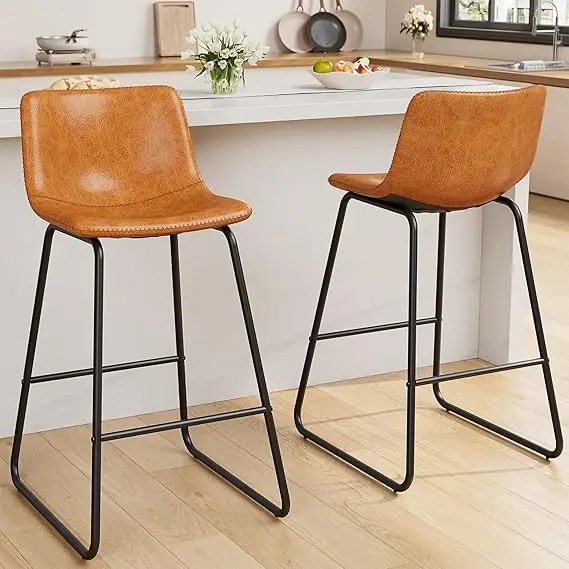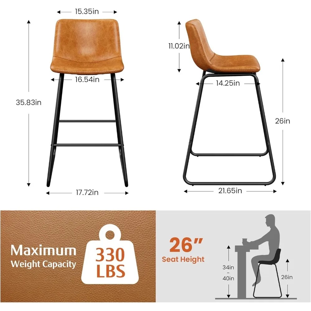 This product features a set of two counter height bar stools with an ergonomic design that provides optimal support and comfort. The curved seat cushion and high backrest are tailored to the human body, ensuring a comfortable sitting experience. Each stool is equipped with a metal footrest, allowing for a relaxed posture and reducing fatigue even after extended periods of use. The stools are constructed with a sturdy and non-slip base and legs made from black powder-coated premium steel, which resists bending and rust. They offer robust support, capable of holding up to 330 lbs, and come with anti-slip protectors to prevent tipping and floor damage. These protectors also minimize noise when the stools are moved. The bar stool set embodies a modern minimalist style, enhancing the aesthetic of your space with its decorative yet functional design. The zigzag double stitching on the seat and back adds a touch of sophistication, elevating the ambiance of your environment. These 26-inch high bar stools are versatile, suitable for various settings such as kitchen islands, bars, restaurants, terraces, and coffee shops. They can seamlessly blend with any decor, whether you're aiming for a contemporary kitchen or an upscale bar atmosphere. Maintenance is a breeze with the stools' PU leather covering, which is waterproof, stain-resistant, and easy to clean. Simply wipe away any marks with a cloth or damp tissue. The stools come with clear assembly instructions and the necessary tools, making the setup process straightforward. Their lightweight design also allows for easy relocation. We stand by our product with a satisfaction guarantee. Should you have any inquiries or concerns about the bar stools, please reach out to us. We are committed to prompt responses and resolving any issues to ensure your satisfaction. Thank you for choosing our bar stools.
