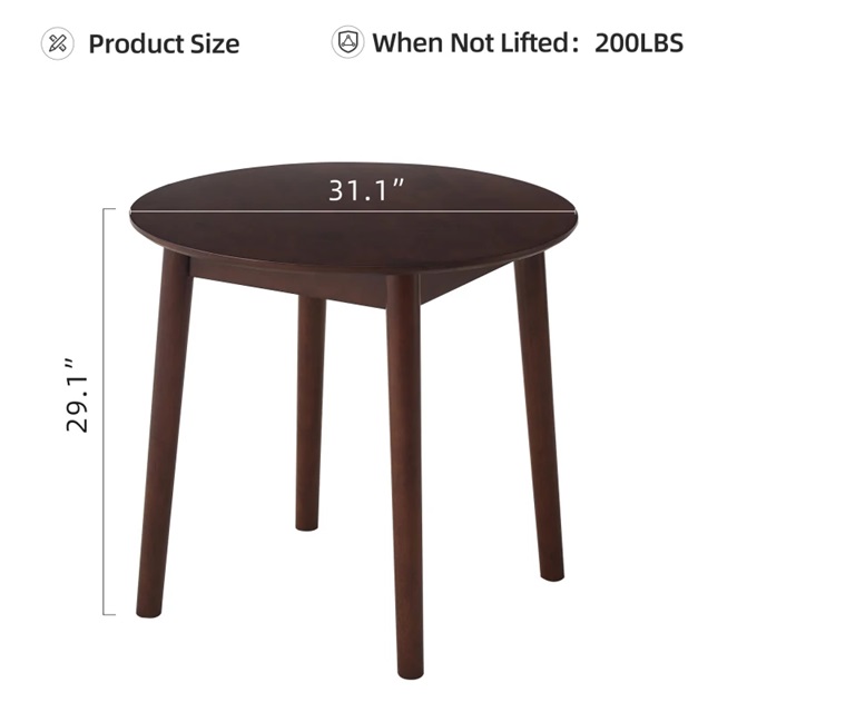 - Size and weight: Round dining table with a diameter of 31.5 inches, the solid wood dining table is designed as a stable structure with four legs and can hold 200 pounds of evenly distributed weight. It can be used comfortably in a small family for 2-4 people