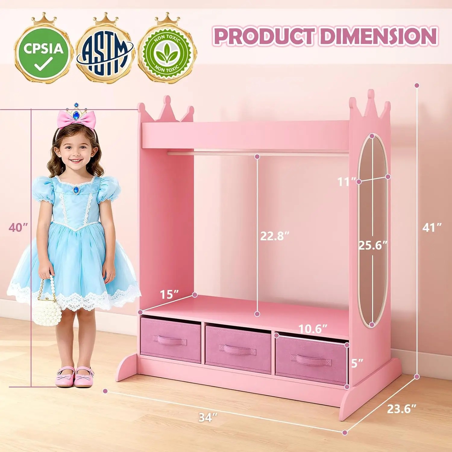 KIDS FRIENDLY SIZE - 34''Lx23.6''Wx41''H. Specious designed for kids, the height is perfect for displaying delicate dress-up dresses and helping kids to view remove and change costumes by themselves. The widened bottom prevents the closet from tipping over.