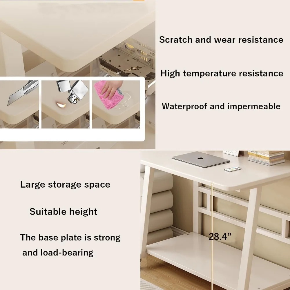 **Product Features:** 1. **Desk with Monitor Stand**: This desk is designed to hold monitors, freeing up space on your work surface for other essentials. It's an ideal choice for setting up a home office. 2. **Rolling Desk**: Equipped with four wheels that can be locked for stability, and unlocked for easy mobility. This feature allows you to move the desk around quickly and conveniently. 3. **Sturdy Structure**: Constructed with a high-quality metal frame and high-density board, this office desk offers exceptional stability and durability. It's suitable for long-term use and is perfect for various settings, including office, work, writing, study, and gaming desks. 4. **Easy Assembly**: Assembly is straightforward. Simply follow the step-by-step instructions, and you'll have your desk set up in just 20-25 minutes.