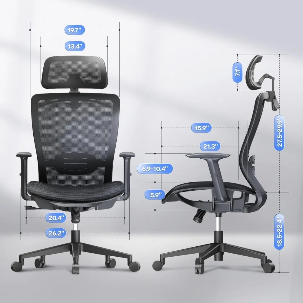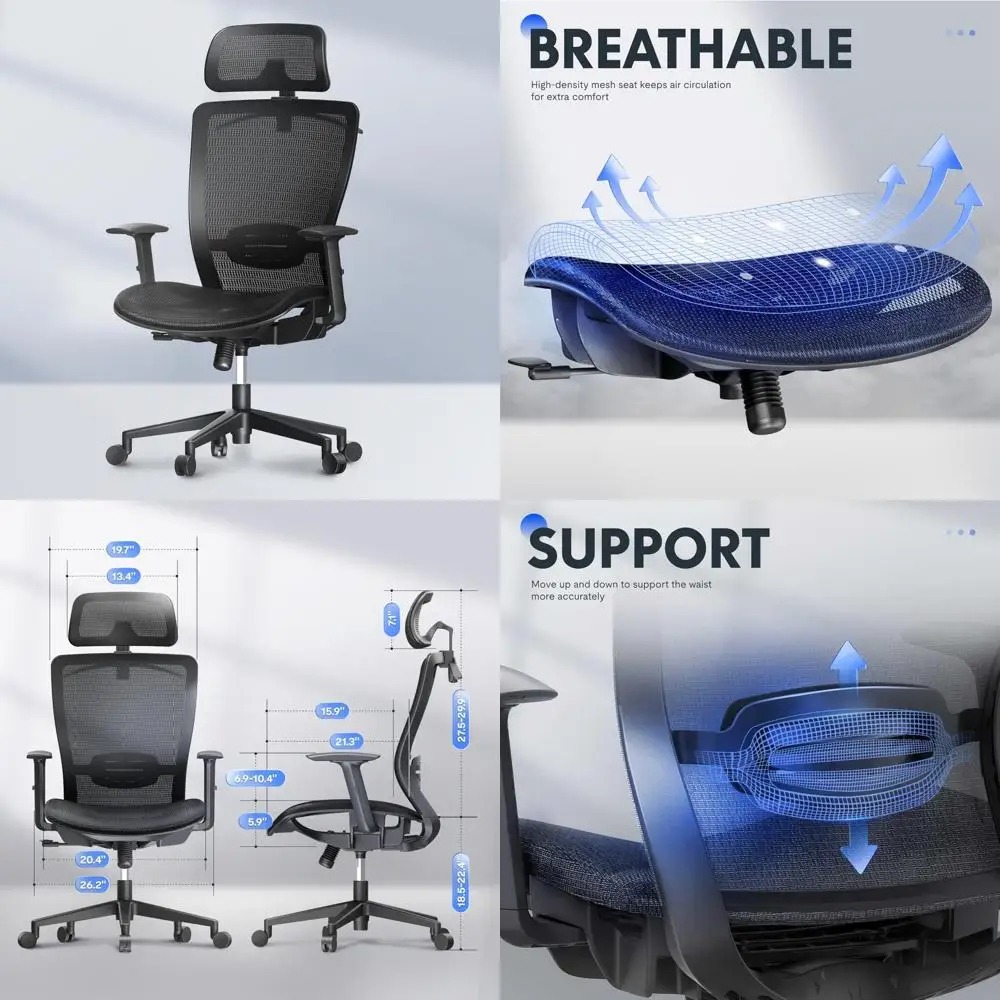 This ergonomic office chair is designed to alleviate low back pain associated with long hours of sitting. It offers reliable back support and passive lumbar support, making it suitable for both home and office use. The chair is versatile, fitting well in living rooms, study rooms, meeting rooms, and offices, and can be used as a computer chair, gaming chair, office chair, or task chair. The chair features adjustable seat height, headrest, backrest, and armrest, catering to various needs and providing comfort for extended periods of sitting. It also includes a backrest hanger for convenient clothing care. With a three-level tilt tension lockable line control mechanism, the chair allows for multiple recline positions, offering flexibility in how you want to tilt the backrest (90-110-130°). The chair's high-quality mesh material is resistant to wear and tear, and the mesh seat ensures optimal air circulation for added comfort. The sturdy metal nylon seat base is designed for reliable weight-bearing, with a maximum capacity of 300 lbs, ensuring stability and durability.