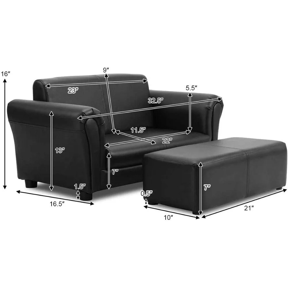 This charming and sturdy two-seat children's sofa set is an ideal choice for young kids, offering them a cozy space for reading, snacking, and watching TV. Sized perfectly for little ones, it comfortably seats one or two toddlers, making it a great addition to any playroom or living area. With this set, you can provide your children with their own special furniture that's just their size. The accompanying ottoman adds extra comfort and convenience for both you and your child. Crafted from the same high-quality material as the sofa, it ensures a cohesive look in your home. The ottoman's size is perfect for your child to sit or lie down comfortably while playing or napping. It's a supportive and cozy spot for you to elevate your feet and relax, whether you're nursing, reading, or just unwinding. The children's sofa set features a lightweight design that enhances its appeal and usability. Easy to move around, it allows your child to arrange their furniture as they wish, fostering creativity and problem-solving skills. The light weight also makes it simple for you to carry the sofa set to different rooms, offering versatile use throughout your home. Not only is this children's sofa set comfortable and stylish, but it's also incredibly easy to clean. If your child spills juice or snacks on the sofa, you can quickly wipe it clean with a damp cloth, making maintenance hassle-free. The durable and stain-resistant material ensures the sofa remains fresh and inviting without requiring extensive cleaning. This adorable children's sofa set is not just a comfortable and stylish addition to your home; it also makes a perfect gift for your child's birthday, Christmas, or any special occasion. Its space-saving and lightweight design makes it suitable for any room, whether it's the playroom, bedroom, living room, or even for sleepovers at grandparents' house. Its versatility also makes it convenient for vacations or nap times.