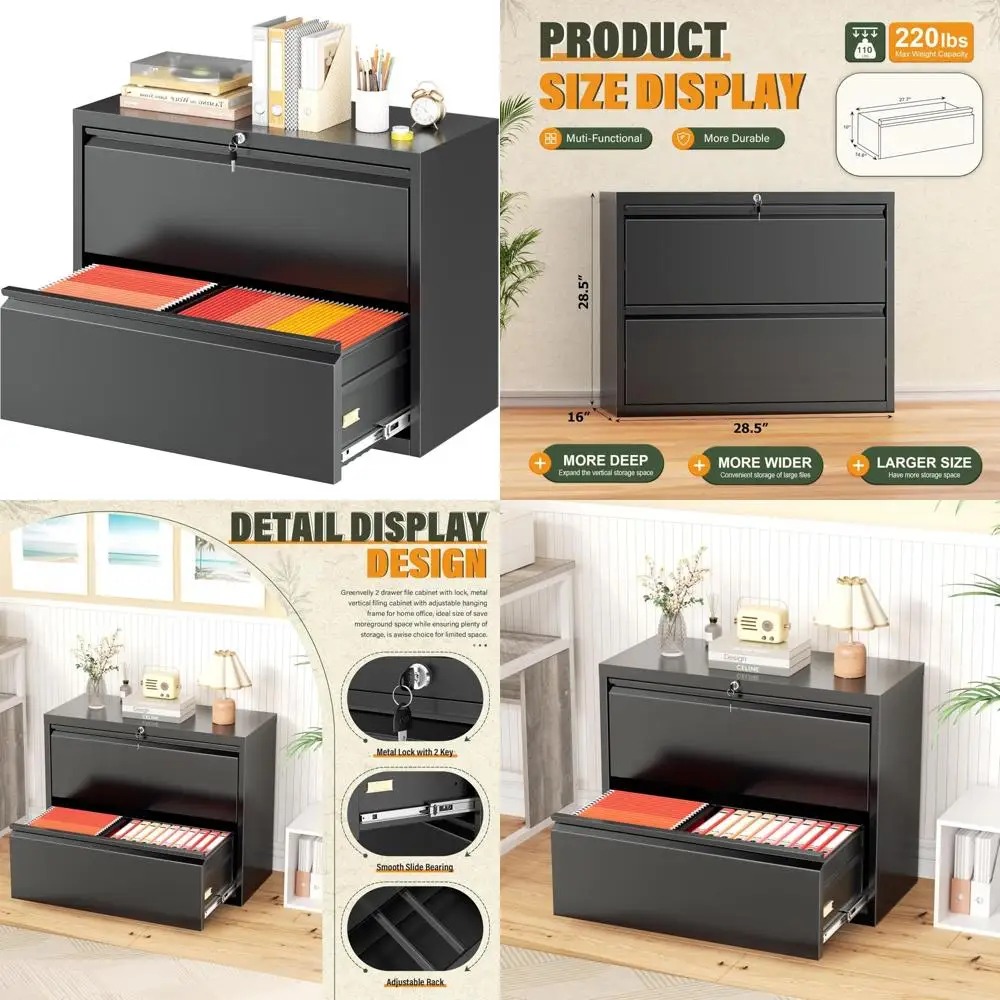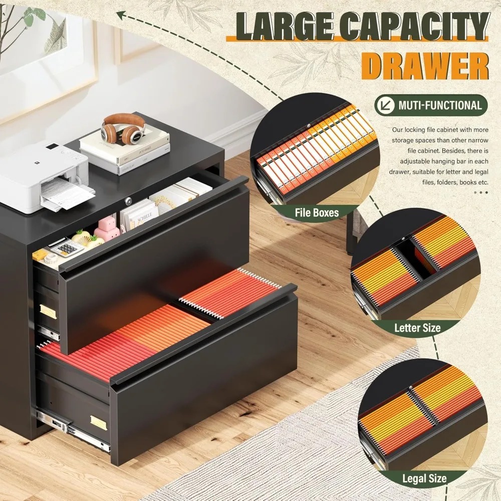 Discover our premium lateral file cabinet, crafted from 100% pure steel for unparalleled stability. Its modern powder coating not only adds to its aesthetic appeal but also protects against scratches, ensuring your cabinet remains pristine for years. Boasting an advanced lock system with precision lock and two spare keys, this cabinet offers a single lock for all drawers, enhancing efficiency and convenience. The anti-tipping design maintains a perfect balance between ease of use and safety. This 2-drawer, lockable cabinet can support up to 220 pounds, making it both sturdy and durable. Its spacious top surface is perfect for organizing various documents, while the drawers are designed to accommodate legal, A4, and F4 sized files with ease, thanks to their precise suspension tracks. Our attention to detail is evident in the drawer slides, which feature precision steel ball bearings and full extension parts, ensuring smooth operation. Additionally, a protective cover at the bottom prevents floor scratches, safeguarding your surfaces. We pride ourselves on our quality service, partnering with multiple couriers to ensure professional and expedited delivery. Thousands of users trust our locked lateral file cabinets. Upon receiving your cabinet, inspect all components thoroughly before assembly, and rest assured that comprehensive installation instructions are included.