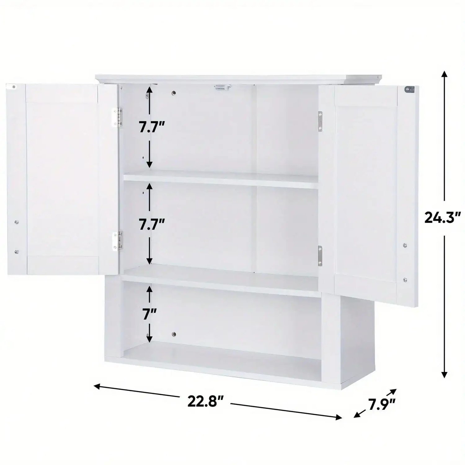 Color: White, Material: MDF Item Weight:7.915kg/17.45lb Internal partition size: 52.3*15.5*1.2cm/20.59*6.1*0.47in Open shelf size: 52.3cm/20.59in Product Dimensions:58*20*61.7cm/22.83*7.87*24.29in Features: 【Material】 Sturdy MDF material, long-use. Moisture-proof material and finish will protect the vanity cabinet from corrosion. 【Multiple Use】The white country style will bring a fresh and calm feeling to your room as a great decoration, the clean lines and simple silhouette add elegance taste to your bathroom, living room, bedroom and kitchen room. 【Storage Function】 This storage cabinet with 2 doors and one shelves will be an ideal space-saving solution for any bathroom, you can store your essentials in it and keep your bathroom neat and tidy. 【Easy to Assemble】With detailed manual and installing tools, it is easy to install.