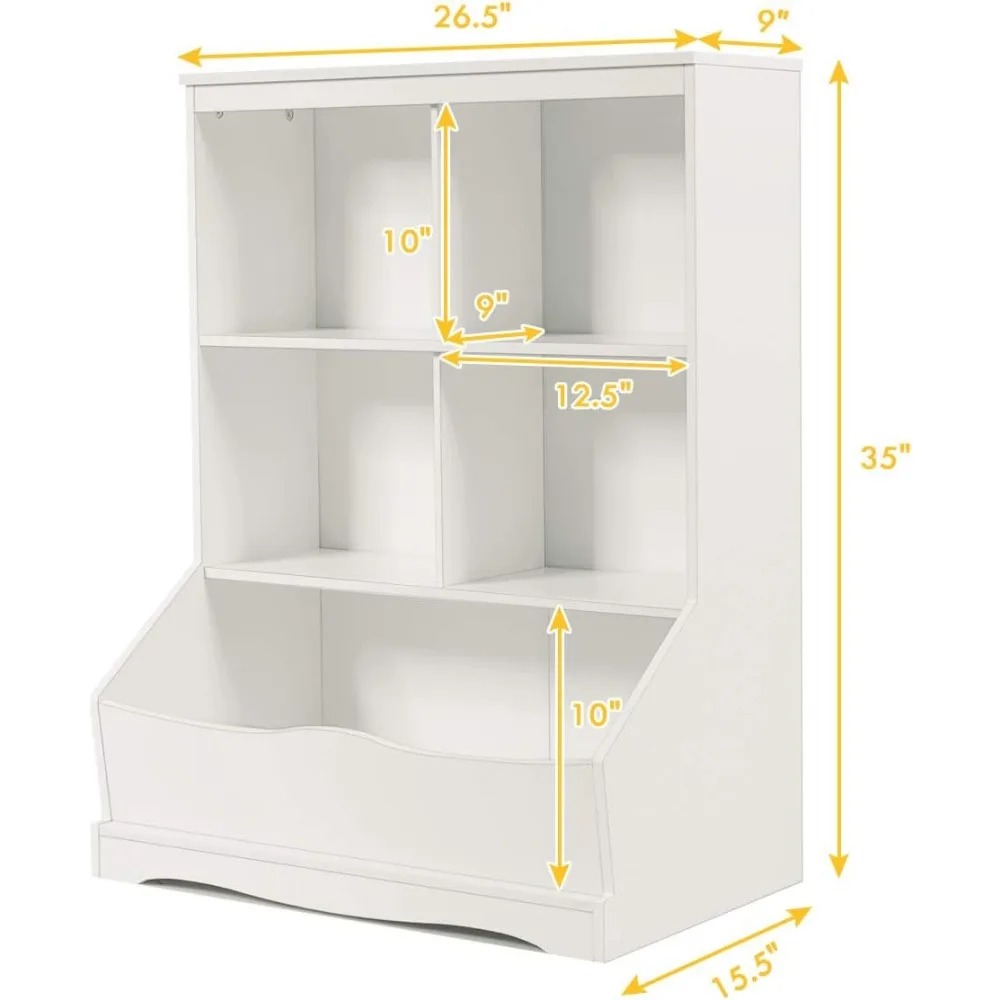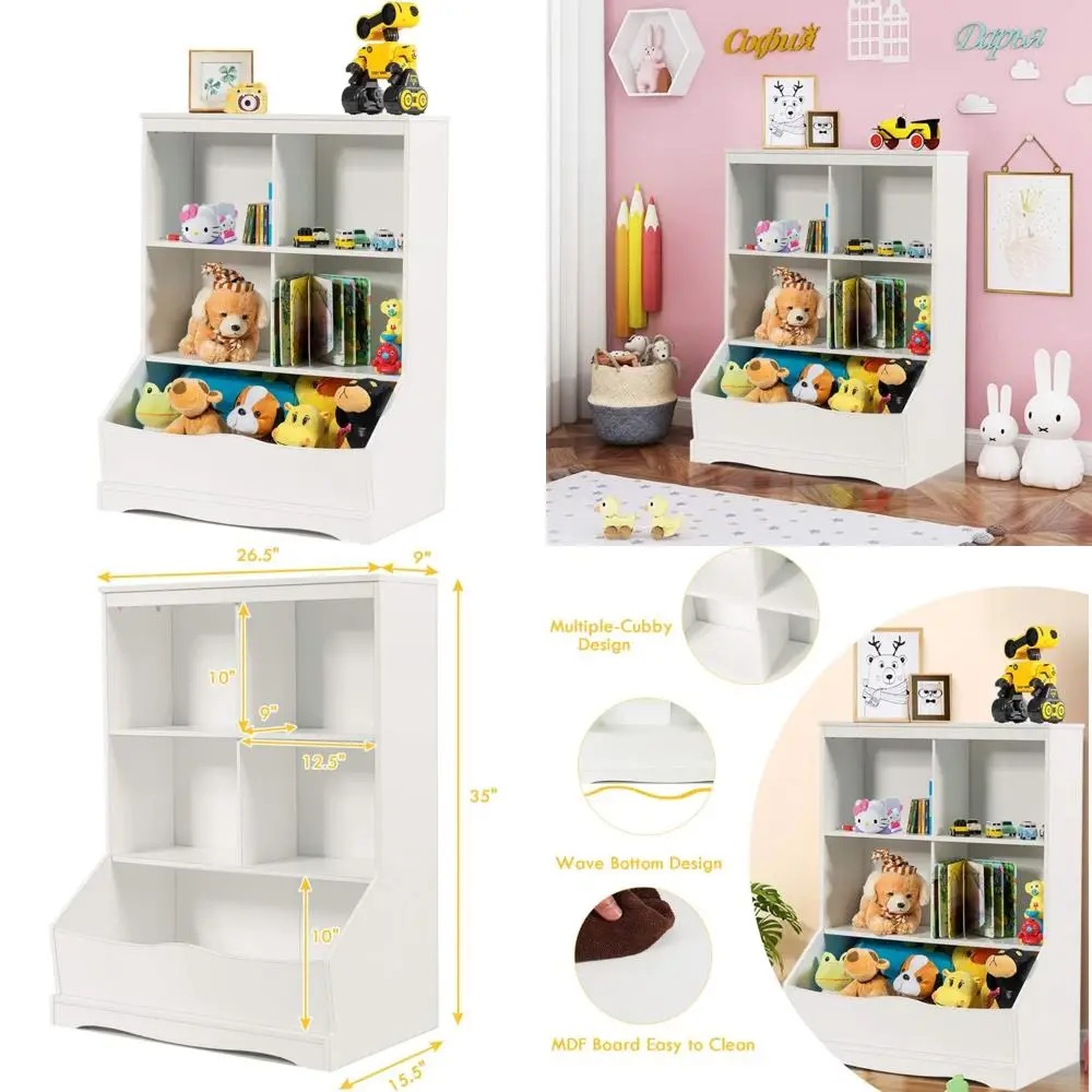 Discover our versatile storage organizer, designed to cater to the needs of both children and adults. With its sophisticated and stylish design, it seamlessly blends into any bedroom or living room decor. This organizer boasts a generous storage capacity, featuring four compartments and a large bin, perfect for storing children's books, toys, and more. The spacious top surface is ideal for displaying decorative items like photo frames and potted plants. Constructed from high-quality MDF board that meets P2 standards, our storage organizer is not only eco-friendly but also built to last. The spray-painted finish offers a smooth touch, vibrant colors, and is both scratch-resistant and easy to maintain. Enjoy the solid structure and robustness of our bookcase, which is enhanced by a wavy bottom design and a thickened frame, ensuring stability and strength. The top can support up to 66 lbs, each compartment up to 22 lbs, and the bottom bin can hold up to 44 lbs. Our three-tier toy organizer, measuring 26.5 inches in length, 9 inches in width, and 35 inches in height, and weighing 29 lbs, makes for an excellent gift. It not only provides ample storage but also helps children develop their organizational and independent skills. --- This description maintains the essence of the original text while avoiding any special symbols or sensitive terms.
