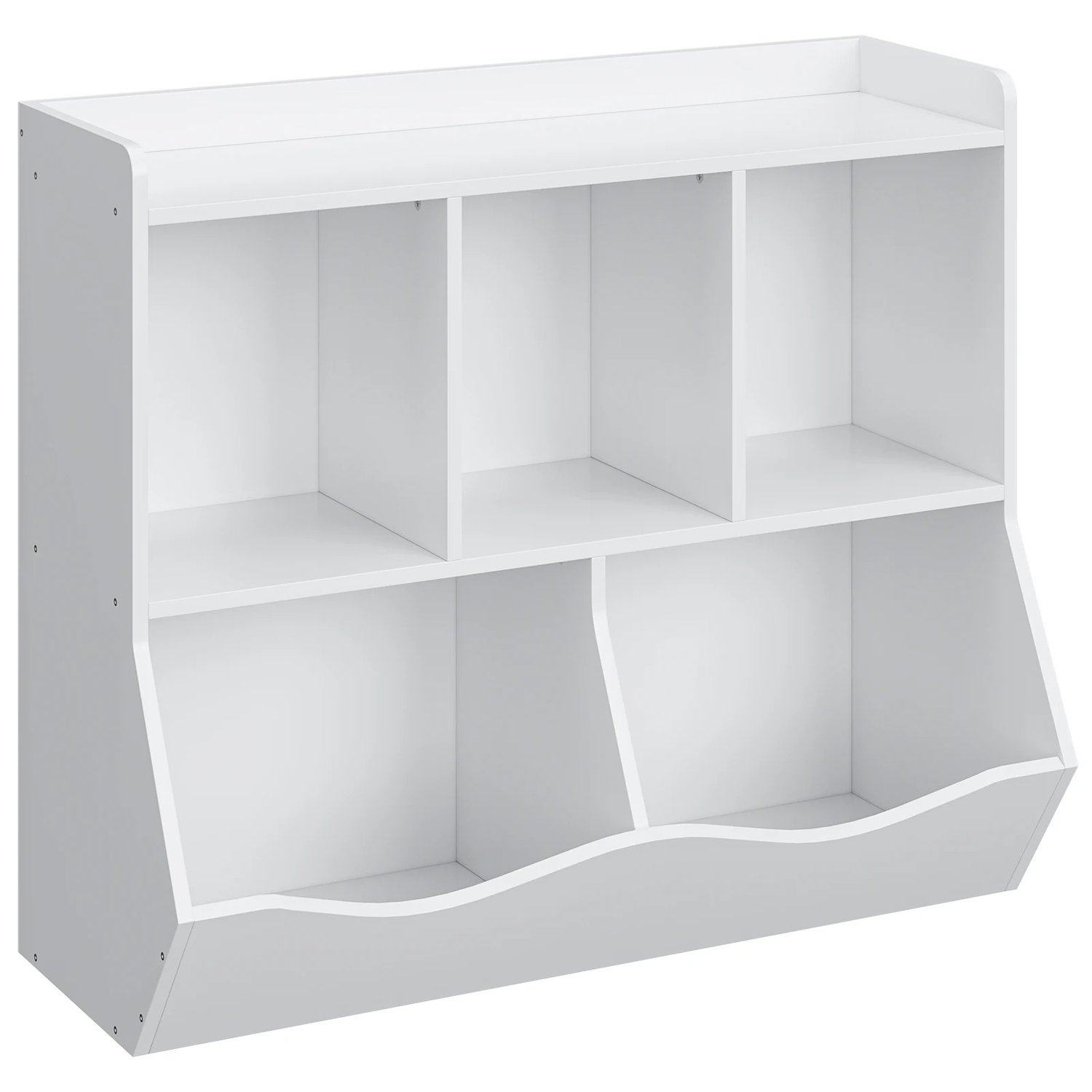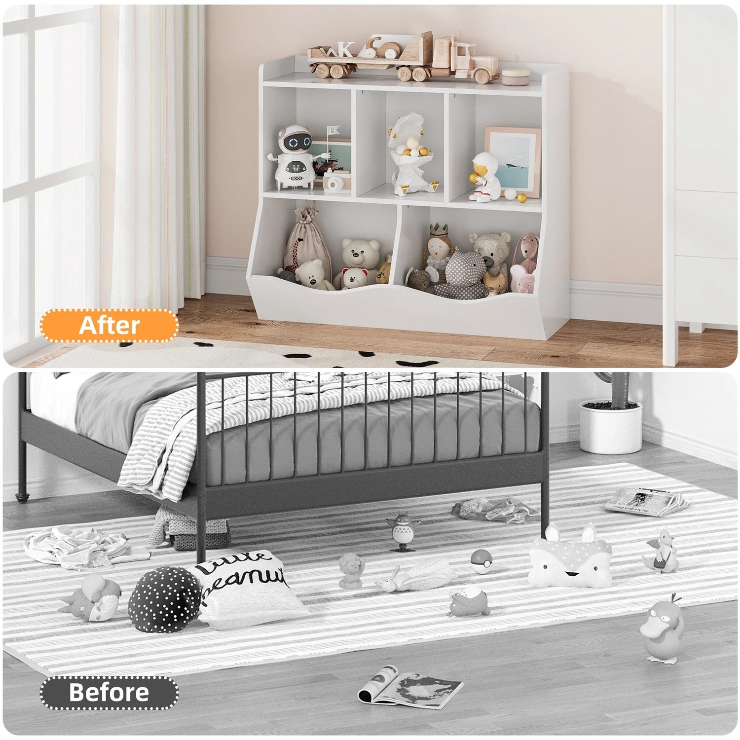 MULTIFUNCTIONAL ORGANIZATION: This toy organizer has 3 open compartments for storing kids' favorite books and notebooks. 2 tiltable organizers provide more storage space for blocks, pickup trucks, dolls and more.